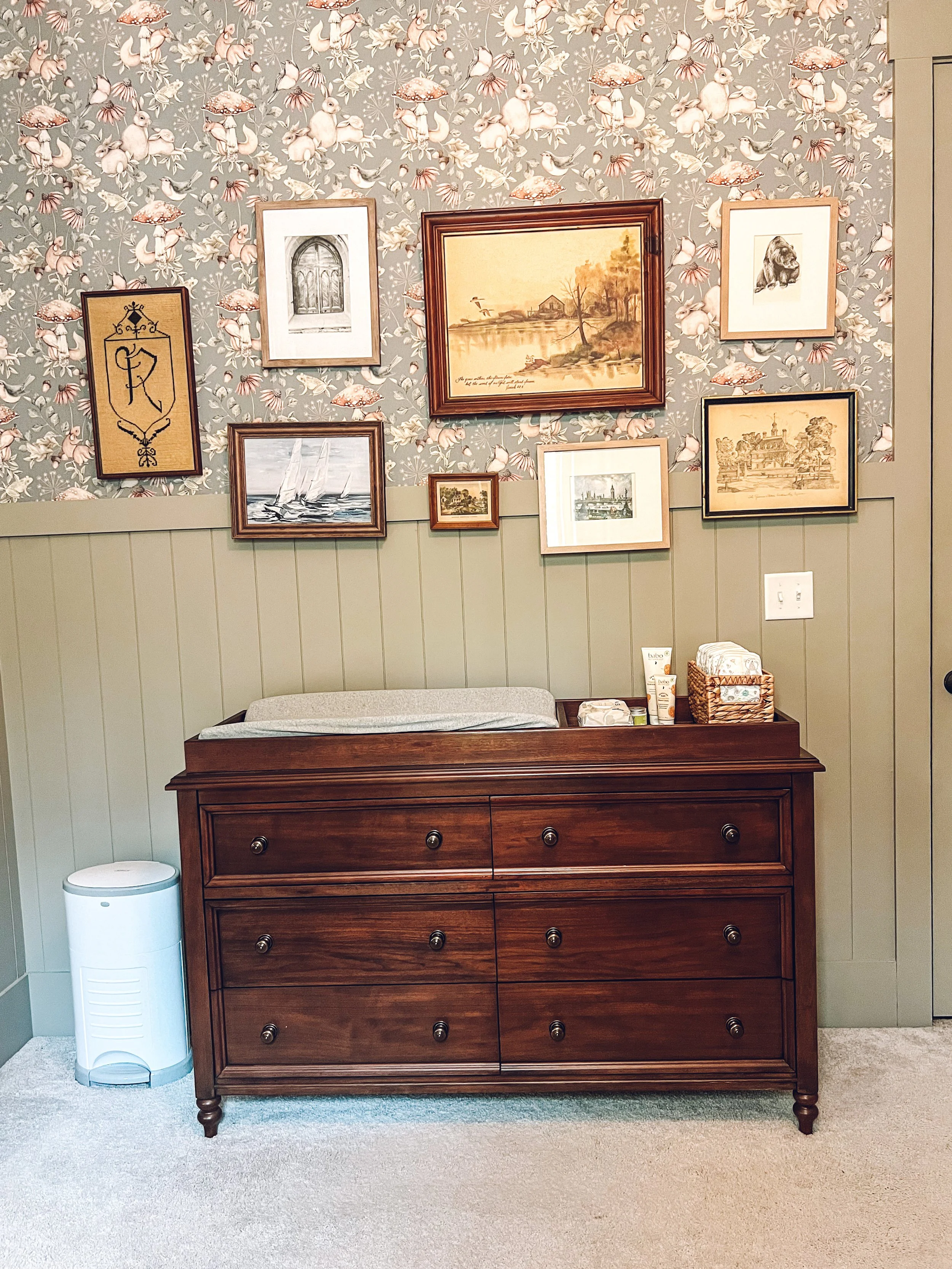 All of the art is thrifted, or collected. Damon and I love to find antique stores or local art when we travel and bring home that home as a souvenir to remember our trip. The sweet print of a mare and her foal were collected on a trip to Savannah when we first got married. I didn’t have a spot for it but I remember saying “This will be so sweet in a nursery one day”. The needlepoint “R” hanging above the changing table was made by Damon’s grandma and is a family crest she recreated from an antique set of tea spoons. How cool is that????