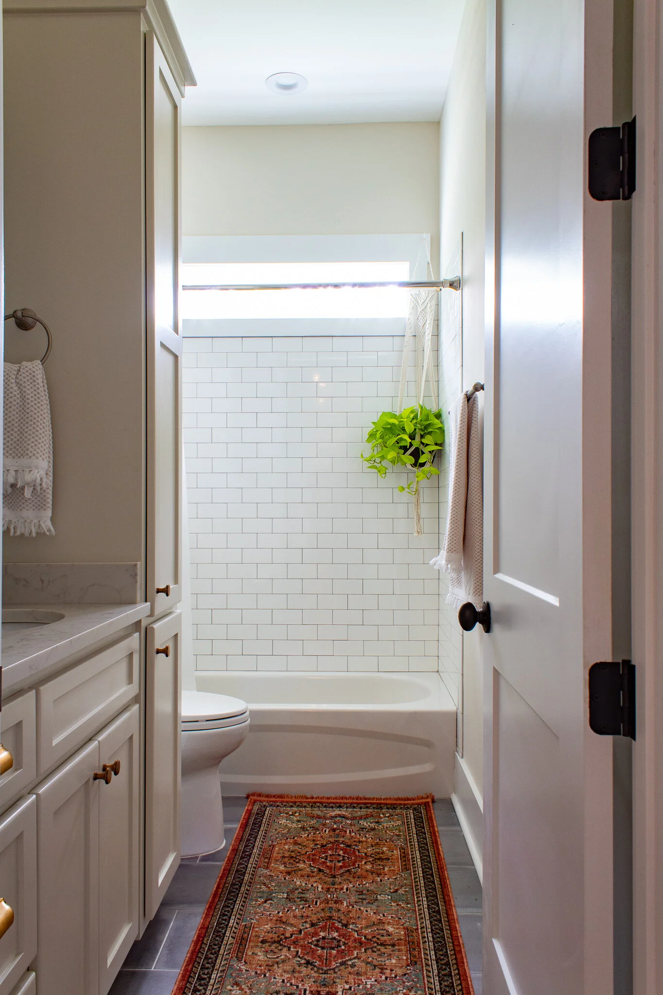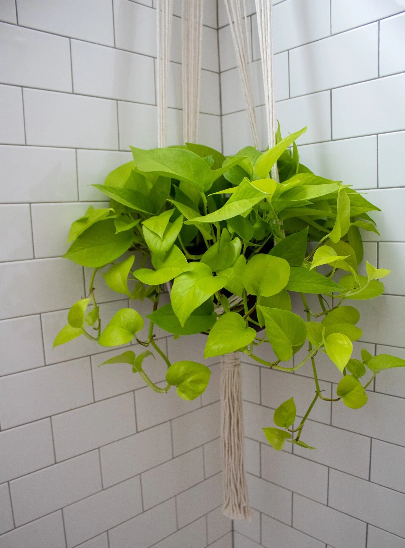 Also called a Money Plant, this silvery-spotted pothos is so tolerant - I basically just wait until the leaves start to wilt before I give it a little water. It hangs in our master bathroom where it gets plenty of bright but indirect light throughout the day.