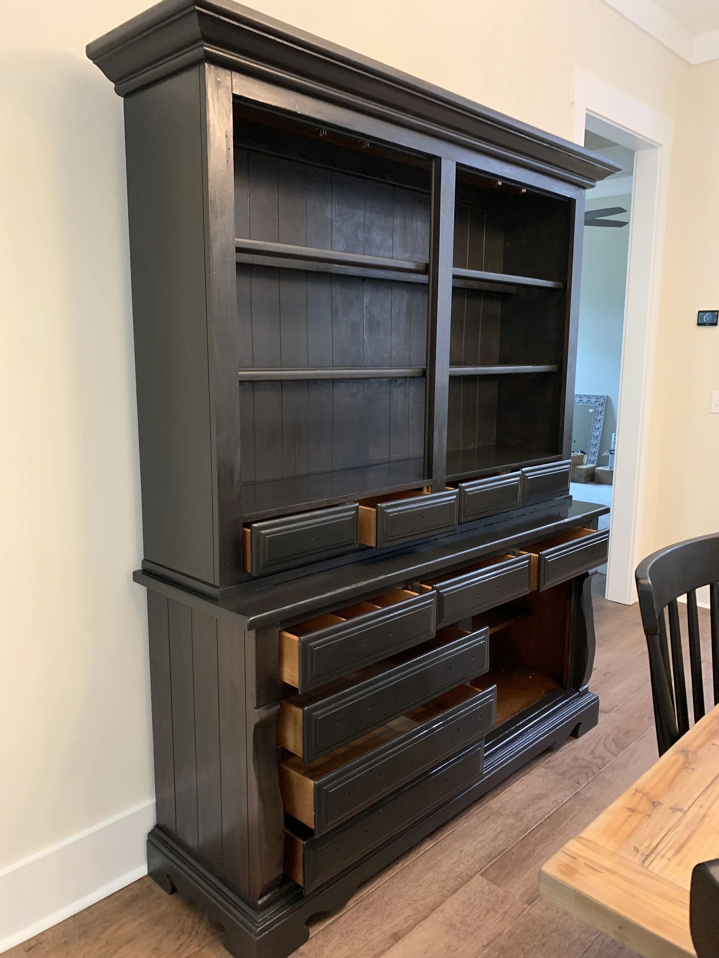 A friend of ours was selling her China Cabinet that they had in their home - it was a really cool antique solid wood hutch and I thought that with a coat or two of paint, it would at least make do until we had the budget to upgrade. For a little over $200 + supplies, it was way more do-able than the $2,500 Magnolia piece!